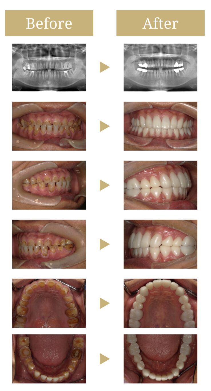 まずは根管治療及び歯周基本治療を先行しました。その後、全体的な咬合安定化を目指し全ての歯を仮歯に置き換え、仮歯で理想的な咬合関係及び補綴形態を目指し調整を行っています。